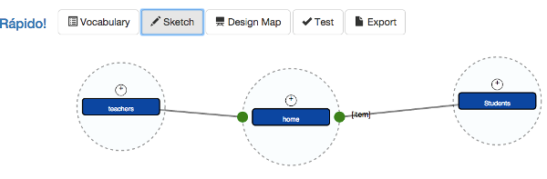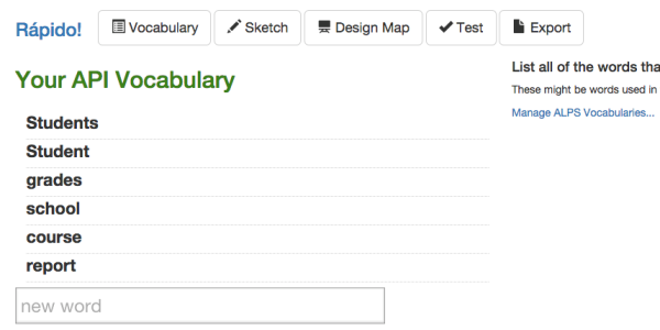 When a designer starts a new Rápido project they are asked to create a vocabulary for the API. After coming up with an initial list of words (or importing an ALPS vocabulary from an external source), the designer can start to form the conceptual model for the API, creating resources, experimenting with URI names and even linking states together in a hypermedia canvas.