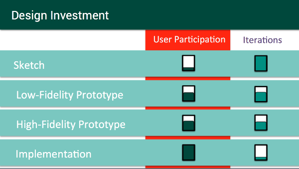 A more reasonable approach is to perform iterations very early in the design process. These early designs should have just enough detail to expose the biggest opportunities for improvement, but not so much that they are hard to build. Over time, we can gradually increase the level of detail (or fidelity) until we finally arrive at a fully realized implementation.